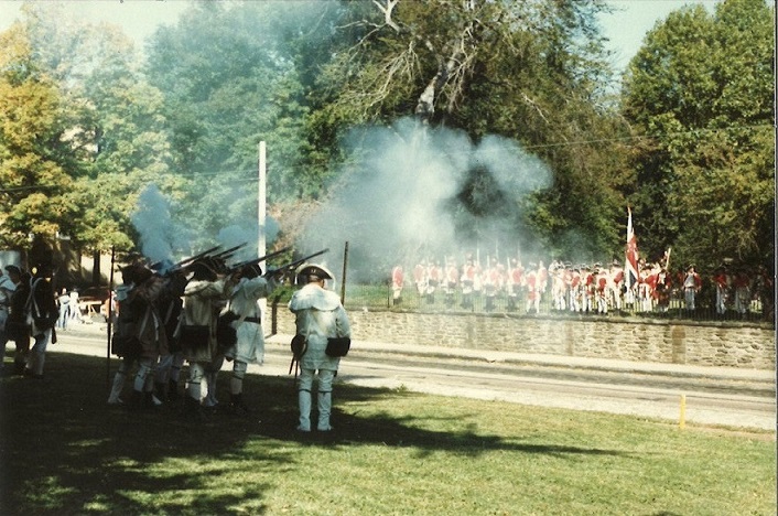 Photo of a recreation of the Battle of Germantown showing British redcoats