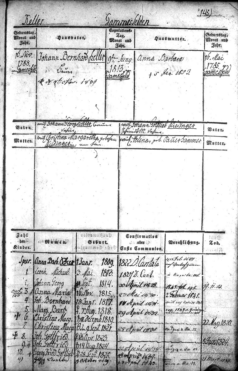 lists the family members of Johann Bernhard and Anna Barbara Keller, with first-born