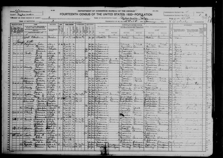 Son George married Caroline ? (1856-1943) by 1879 when they had a son Raymond born in Iowa. In 1920 Raymond, age 40, headed a household in Milwaukee WI and listed his place of birth as Iowa, his father's place of birth as WI, his wife as Ella, age 37, born in WI [1920 US Census, Milwaukee WI, line 71, enumerated Jan 2-3, 1920].